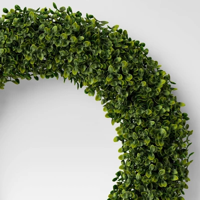 Welcome your guests in style with this Christmas Boxwood Velvet Wreath from Wondershop™. This Christmas wreath features faux boxwood arranged in a circular shape for a realistic look and is accentuated by a red ribbon for a festive touch. Suitable for indoor and sheltered outdoor use, you can hang this Christmas wreath on the front door or windows or above your mantelpiece.