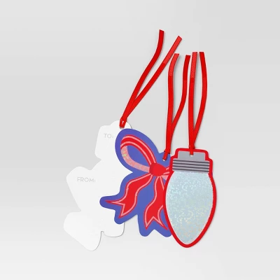 Add a whimsical touch to your holiday gifts with these 50-Count Christmas Wrap Essentials Gift Tags from Wondershop™. This set includes 50 gift tags, each featuring cheerful, festive designs such as snowflakes, decorative bows, and light bulbs, for a seasonal touch. Additionally, these to-and-from gift tags feature a red tie closure for easy attachment.
