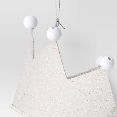 Add a graceful, royal touch to your tree with this Christmas Metal Glitter Crown Christmas Tree Ornament from Wondershop™. Made from plastic and iron, this ornament is designed as a glittery white crown featuring pointy tips with white beads for a beautiful look. Plus, it’s equipped with a top loop for easy hanging from the branches of your tree.